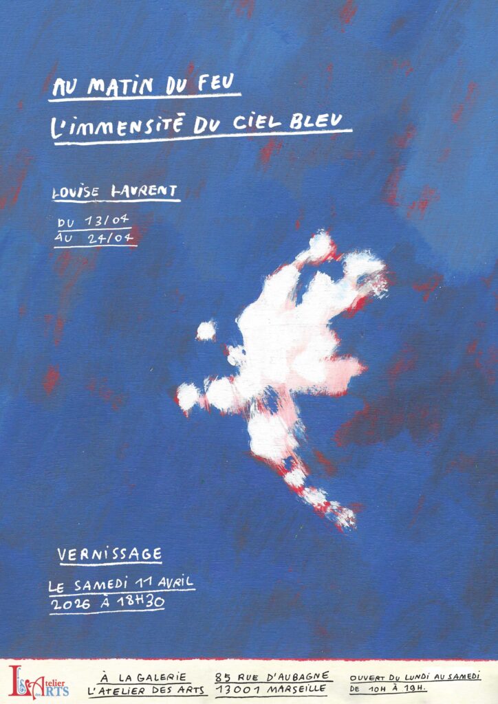 Venez nombreux au Vernissage de l’exposition : Samedi 11 Avril à 18h30. Exposition de l’Artiste Peintre : Louise laurent du Lundi 13 au vendredi 24 Avril 2026 à la galerie l’Atelier des Arts adresse : 85 rue d’Aubagne 13001 Marseille